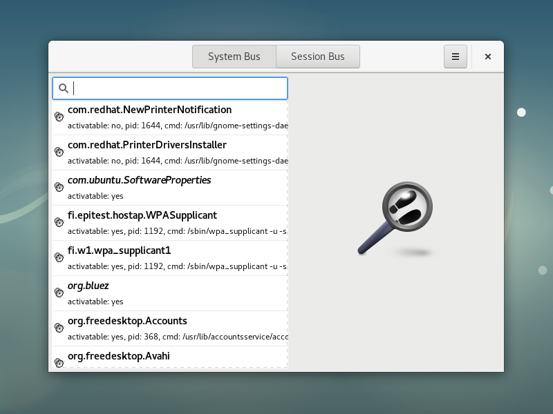 Ainda que a possibilidade de interagir com o D-Bus diretamente pela linha de comando seja bastante útil, inclusive para automatização com shell scripts, não se trata de uma maneira fácil de explorar e compreender as conexões ativas a um bus, os objetos associados a elas, seus métodos, sinais e propriedades. Uma melhor alternativa é o D-Feet, um software com interface gráfica dedicado às tarefas de debugging relacionadas ao D-Bus e mantido como parte do projeto GNOME.