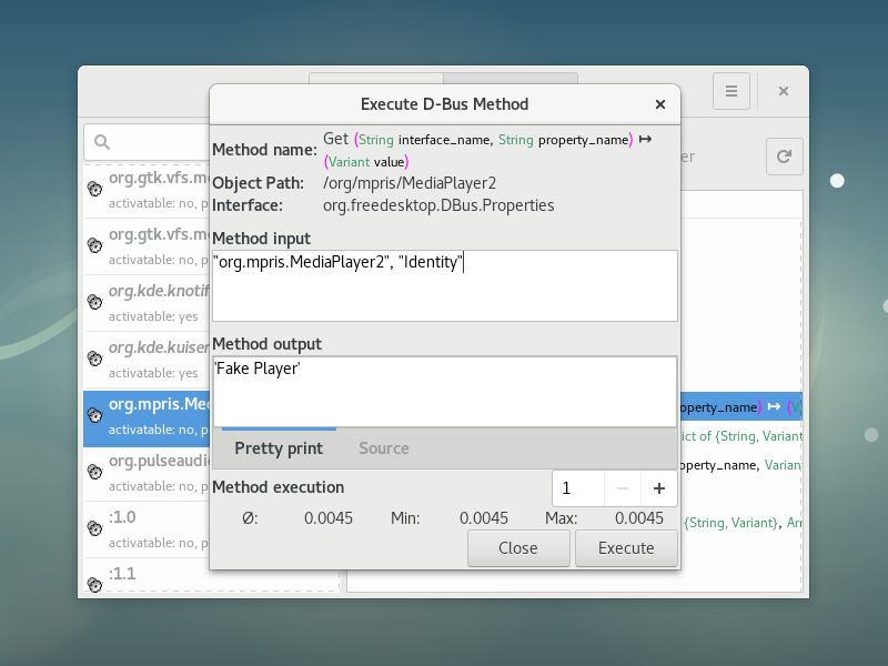 No exemplo acima, vemos o D-Feet exibir o único objeto criado pela fakeplayer, de object path /org/mpris/MediaPlayer2, que, por sua vez, define a propriedade Identity, com permissão somente de leitura. Foi efetuado um duplo clique sobre o seu nome para que o valor associado fosse exibido: “Fake Player”.